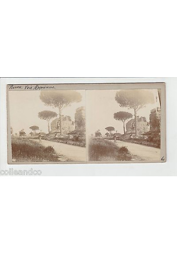 Ancien carton stéréoscopique vers 1910 celui-ci à la particularité de comporter 2 clichés / photos collées sur le RECTO ET VERSO :. - Recto : ITALIE Rome : Voie Appienne (vue bi-color). - Verso : ITALIE Rome : Voie Appienne avec ruines
